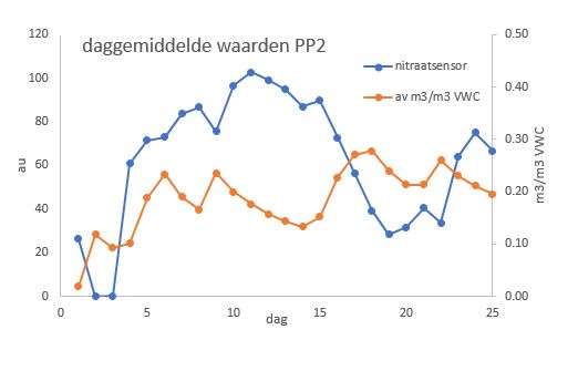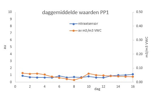 De kalibratie is op dit moment nog vrij eenvoudig, vooral omdat er geen referentiewaarden voor nitraat beschikbaar waren bij deze veldproef. Door het ontbreken van een beschermende coating, was er mogelijk invloed van humuszuren. Ook de correctie voor chloride was hier nog niet geïmplementeerd. Hierdoor is nog onzekerheid over de absolute waarde. Vandaar dat de nitraatgehaltes nog in arbitraire eenheden (au) zijn weergegeven als mate van lichtopbrengst. Vanwege de nog vrij eenvoudige kalibratie en de correcties die nog beter uitgevoerd moeten worden, overschatten de meetwaarden waarschijnlijk de werkelijkheid. Echter, het geeft wel duidelijk de trend in de drie proefperiodes weer. Als het vochtgehalte laag is wordt geen nitraat gemeten (PP1), en als het vochtgehalte toeneemt wordt initieel een toename van het nitraatgehalte gezien, gevolgd door een afname als gevolg van opname door de plant (PP2, PP3).