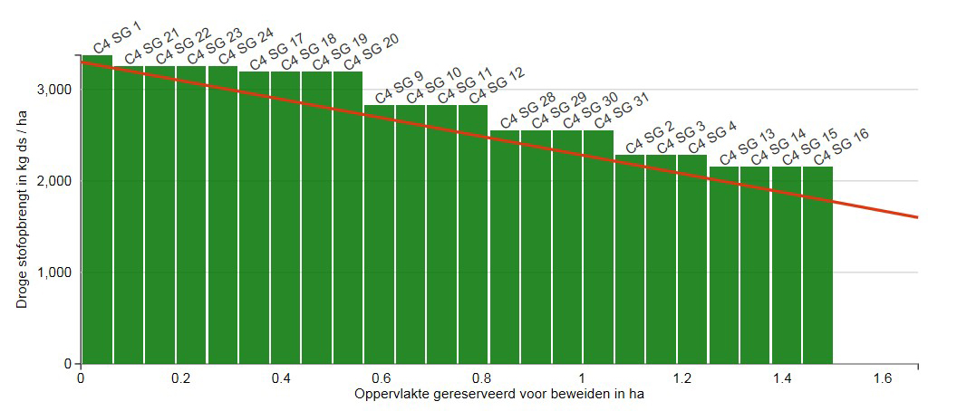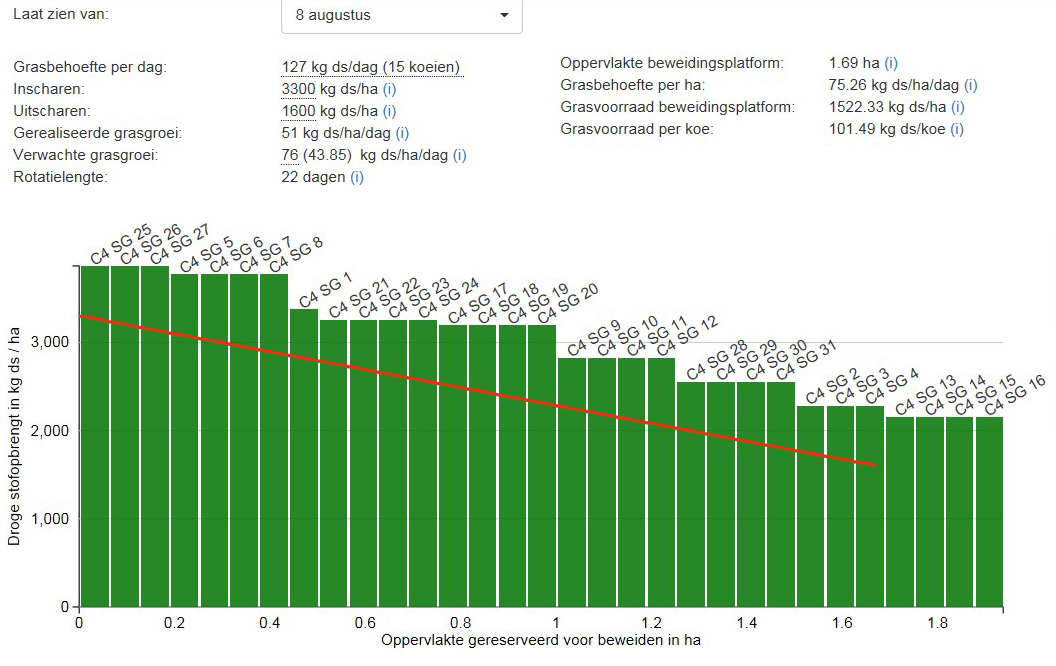 De rode lijn in figuur 3 loopt nu mooi evenwijdig aan de groene staven. Dat wil zeggen dat grasaanbod en -behoefte aan elkaar gelijk zijn. De rode lijn loopt echter verder door dan de groene staven. Dit betekent dat de oppervlakte die nodig is voor het beweiden te klein is bij de uitgangspunten van 8 augustus. Er zijn dus meer percelen nodig voor een de rotatielengte van 22 dagen. Deze komen van de gemaaide percelen. Daar (her-)groeit het gras immers ook, waardoor ze op termijn, bijvoorbeeld de week er op, weer aan het beweidingsplatform toegevoegd kunnen worden.