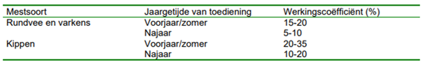 De stikstof uit vaste mest is voor een groot deel (80%), organisch gebonden, waardoor deze langzaam beschikbaar komt. Houd daar dus goed rekening mee. Bij in het voorjaar toegediende vaste mest op grasland, werkt 15-20% van de stikstof in de daaropvolgende snede [zie tabel 1-10 van de adviesbemesting). Voor elke groeimaand na de eerste snede komt 5% van de toegediende gift tot werking. Bij een gift van 20m³ per ha grasland betekent dit dus een werking van ongeveer 25 kg N/ha voor de eerste snede, en 6,5 kg N/ha per groeimaand. Voor maisland staat een gift van 20 m³/ha gelijk aan ca. 50 kg N/ha.