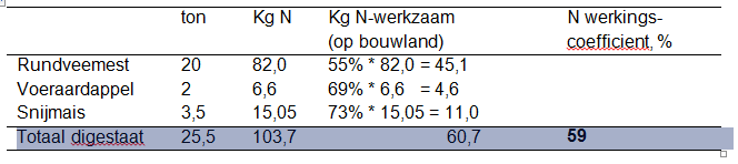 Een digestaat is gemaakt door vergisting van 20 ton rundveedrijfmest, 2 ton voeraardappelen en 3,5 ton snijmais. Met de N-gehaltes en N-werkingen uit Tabel 1 wordt de totale hoeveelheid N in deze partij 103,7 kg N, de N-werkingscoefficient 59 % en de totale werkzame N 60,7 kg N.