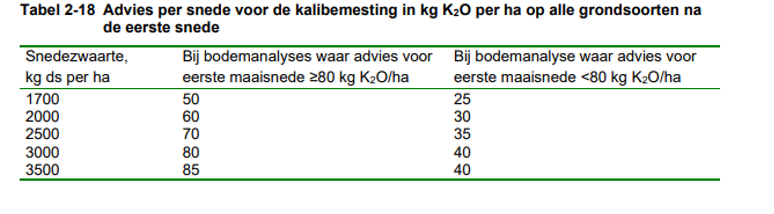 Kali is belangrijk voor de vitaliteit van het gras en daarmee voor de groei. Bedroeg het eerste snede advies meer dan 80 kg K2O per ha, geef dan 70-80 kg K2O per ha voor een volgende maaisnede via dierlijke mest of kunstmest. Dat geldt zeker voor grasklaver percelen. In alle andere situaties is geen aanvulling nodig, de nalevering van eerder gegeven mest volstaat.