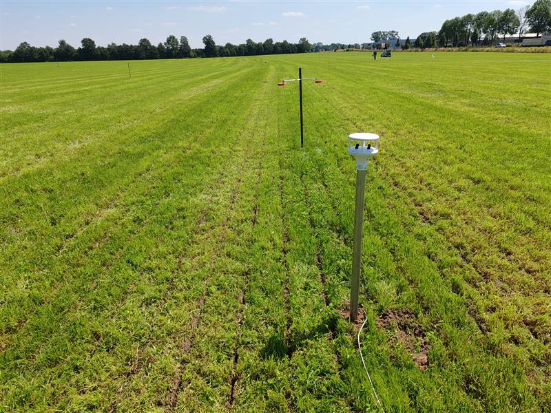 De stoffen die goed presteren in het lab, testen we vervolgens in veldproeven. Hiervoor gebruiken we een prototype zodenbemester van Slootsmid, die in één werkgang zowel mest als afdekmiddel aanbrengt in een proefveld. Ammoniakmetingen voeren we uit met behulp van ammoniaksensors in het midden van het veld en aan de windzijde. Daarbij meten we ook de windsnelheid en temperatuur om een nauwkeurige emissiebepaling te maken.