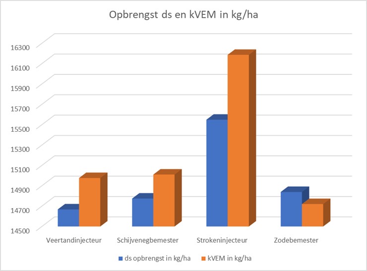 In deze grafiek is te zien dat de kVEM-waarde van de zodenbemester lager is dan de drogestofopbrengst in kg/ha. De zodenbemester geeft daarom een maisopbrengst met VEM-waarde onder de 1000, de andere technieken zitten daarboven. Daarom. De strokeninjecteur had zowel de hoogste opbrengst in drogestof, als ook de hoogste VEM-waarde (1041). De gebruikte drijfmest had helaas lage waardes voor stikstof en fosfaat (respectievelijk 3,3 N en 0,94 P) en er is later in het groeiseizoen niet bijbemest met kunstmest, waardoor de opbrengstpotentie niet geheel gehaald is.