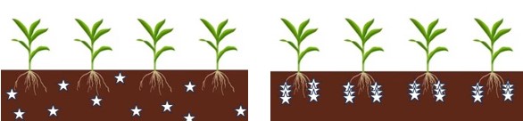 Afbeelding 2: Links bemesting vóór het ploegen. De mest zit meer verdeeld en dieper in de grond. Rechts strokeninjectie ná het ploegen. De mest zit dicht bij de wortel van de maisplant.