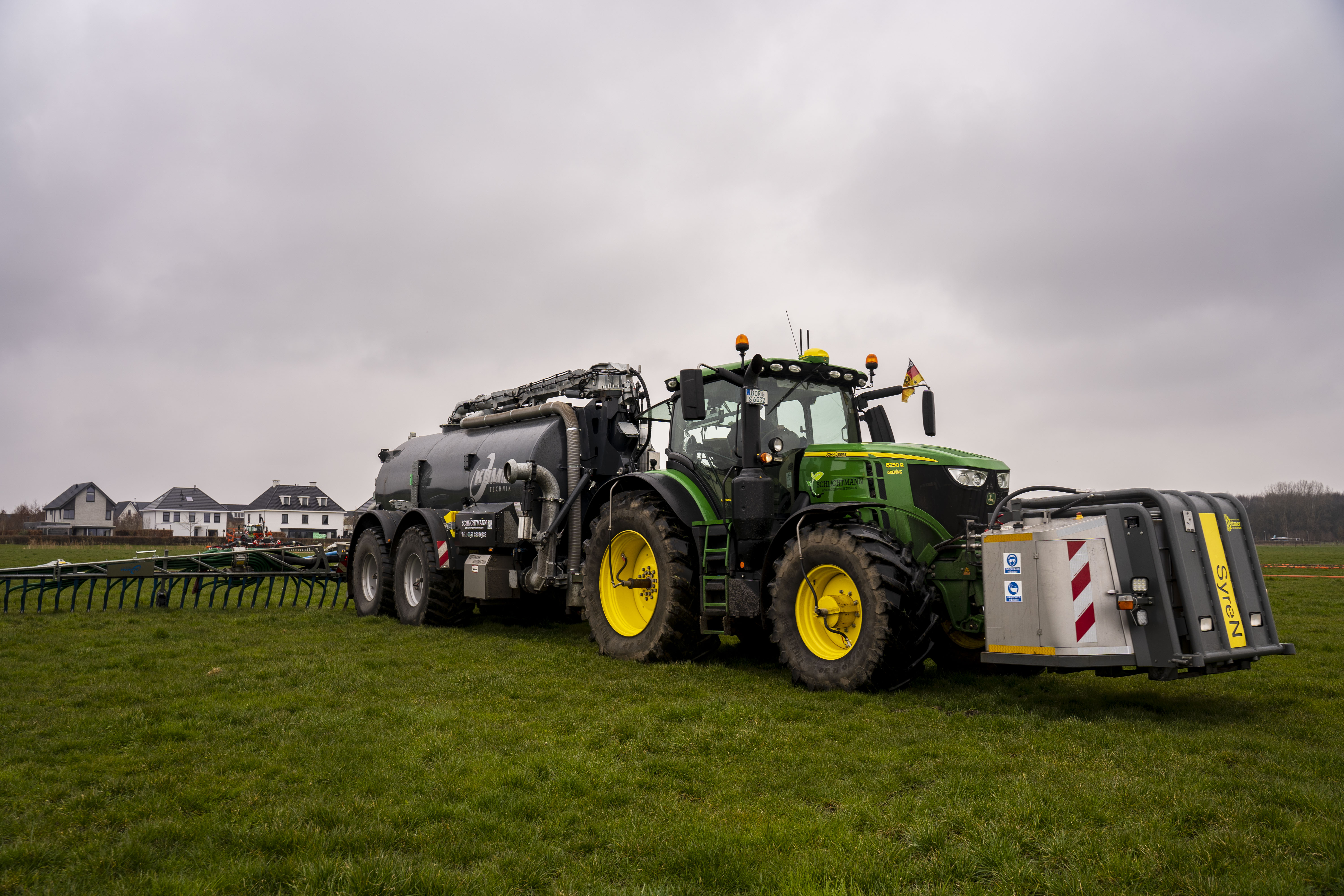Machinebouwer Slootsmid Mesttechniek werkt aan emissiereductie bij zodenbemesting door het afdekken van de sleuven met een vloeistof. De zodenbemester is daarvoor uitgerust met een vloeistofdoseerunit direct na de mestuitstroomopeningen. Slootsmid test deze opstelling met verschillende vloeistoffen en denkt hiermee de ammoniakemissie met 40% terug te kunnen brengen. Tijdens de demo konden de aanwezigen een proefelement met vloeistofdoseerunit bekijken.