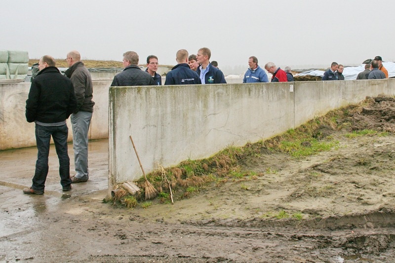 Op het bedrijf van Buijs is goed nagedacht over de erfvoorzieningen. Opvallend is dat de kuilen zo aangelegd zijn dat de transportroutes van de kuilen naar de stal kort zijn. Daardoor is het oppervlak waarop voer gemorst kan worden klein en is het eenvoudiger om het erf schoon te houden. Een cascadesloot die water dat van het erf afloopt, zuivert voordat het uitloopt op de waterschap sloot lijkt behoorlijk effectief. Toch is het afhankelijk van het waterschap hoe deze voorziening beoordeeld wordt. Putten met verontreinigd water komen uit in een opvang van 7 kuub. Dit werd bijna als overdreven beschouwd toen Buijs deze opvang aanbracht, maar wordt nu al weer bijna als klein gezien. Erfwater dat niet verontreinigd is watert op in de cascadesloot via een buis. Bij calamiteiten kan deze buis afgedopt worden, zodat erfwater als het onverhoopt verontreinigd is geraakt, afgepompt kan worden. Het erf in zijn geheel wordt door de aanwezigen beoordeeld als bezemschoon. Daar zorg Buijs bewust voor. Hij heeft de ervaring dat er goed meegedacht wordt door waterschapmedewerkers als je laat zien dat je netjes werkt. Toch zou hij het erf nu weer anders inrichten als hij het opnieuw mocht doen. De belangrijkste aanpassing: een scheiding aanbrengen tussen de voeropslagen enerzijds en het erf anderzijds. Vuil water uit de opslagen kan dan direct worden opgevangen. Bij een schoon erf mag het regenwater direct worden geloosd. Dus schoonhouden van het erf en scheiden van opslagen is bij Buijs het belangrijkste.