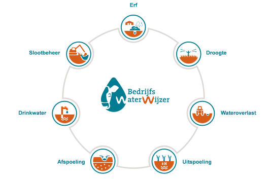 Om inzicht te krijgen in de watersituatie op het bedrijf en de bijbehorende risico’s voor bedrijf en milieu, ontwikkelt het project Koeien & Kansen de BedrijfsWaterWijzer (BWW). Dit instrument werkt via het internet en gebruikt onder andere informatie uit de KringloopWijzer. De BedrijfsWaterWijzer werkt met zeven modules, zie ook bijgaande figuur. Het betreft de modules Erf, Droogte, Wateroverlast, Uitspoeling, Afspoeling, Drinkwater en Slootbeheer. De verschillende modules worden één voor één in volgende edities als nieuwsbericht van Koeien & Kansen uitgewerkt.
