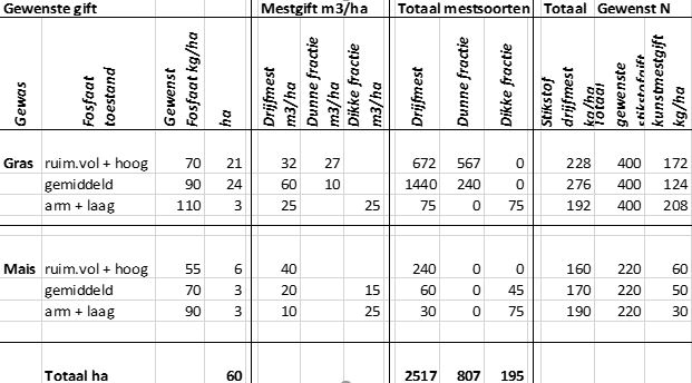Uit bovenstaand tabel blijkt dat met het scheiden van 1000m3 drijfmest aan deze wens voldaan kan worden. Op 3 ha gras met een arm/lage fosfaattoestand, wordt 25m3 dikke fractie per ha gegeven. Op 3 ha mais in met een gemiddelde fosfaattoestand, wordt 15m3 gegeven en op 3 ha maisland met een arm/lage fosfaattoestand wordt 25m3 dikke fractie per ha gegeven. Zorg op alle percelen voor een passende aanvulling met stikstof en kali uit kunstmest. Daar waar dikke fractie is gebruikt is meer stikstof en kali uit kunstmest nodig.