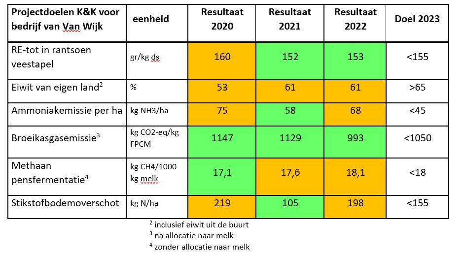 De projectdoelen staan in onderstaande tabel waarin ook de resultaten van 2020, 2021 en 2022 staan. De doelen voor RE-tot in het rantsoen, eiwit van eigen land en broeikasgasemissie zijn overigens voor alle Koeien & Kansen bedrijven gelijk. De doelen voor ammoniakemissie, methaan pensfermentatie en stikstofbodemoverschot zijn bedrijfsspecifiek. Een groen vlak in onderstaande tabel betekent dat het betreffende doel in het specifieke jaar gehaald is.