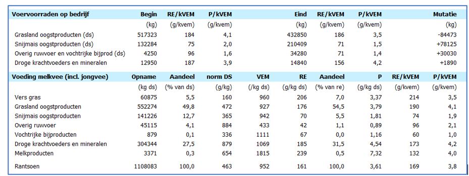 Het vers gras en kuilgras is volledig eigen geteeld, van de snijmais is 71.456 kg droge stof aangekocht en de overige voersoorten zijn volledig aangekocht. Ten eerste moet worden bepaald hoeveel droge stof er nodig is om 1 kg meetmelk te produceren (1.108.083 / 1.280.888 = 0,87 kg DS/kg MM). Vervolgens moet de aankoop per kg meetmelk worden bepaald (425.165 / 1.280.888 = 0,33 kg DS/kg MM). Dit getal wordt gecorrigeerd voor de voorraadmutatie, zodat extreme verschillen tussen jaren worden uitgevlakt (25.572 / 1.280.888 = 0,02 kg DS/kg MM). Dit maakt dat er, gecorrigeerd voor voorraadmutatie, 0,33 – 0,02 = 0,31 kg DS/kg MM wordt aangekocht, wat procentueel dus 0,31 / 0,87 = 36%. Met andere worden is 64% van de melk geproduceerd uit het eigen voer. Per hectare is dat 20.248 * 64% = 12.959 kilogram meetmelk uit eigen voer per hectare.