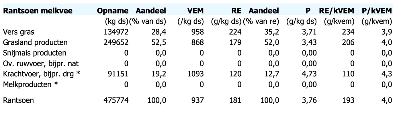 Kijk eens terug hoeveel en hoe u het eiwit vanuit het gras in 2020 heeft gecompenseerd? Soms is er in de praktijk veel mais gevoerd en was het gras eiwitarm, waardoor er (veel) meer soja aankoop nodig was. Hoe kunt u als ondernemer met resultaten uit de KringloopWijzer deze situatie in de toekomst voorkomen? Pak bijlage 2 uit de KringloopWijzer erbij. In deze bijlage wordt het rantsoen inzichtelijk gemaakt. Het geeft een jaargemiddelde over alle diergroepen weer. Nieuw in deze bijlage is het aandeel Ruw Eiwit in het rantsoen als percentage van het totaal. In het algemeen is het zo dat eiwitrijk gras gecompenseerd wordt met eiwitarme mais waardoor er netto op de norm gevoerd wordt..