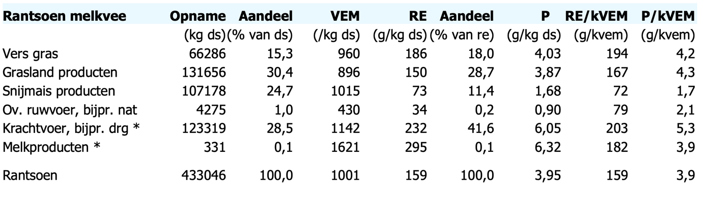 Hieronder staan twee verschillende rantsoenen waarbij op bedrijf 1 alleen maar grasproducten worden gevoerd en op bedrijf 2 ook mais.