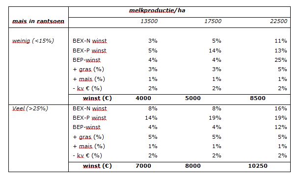 Het huidige BEP-voordeel bij de intensieve situatie met veel maïs in het rantsoen is gebaseerd op de prestatie van het een Koeien & Kansen bedrijf in het Zuidelijke zandgebied. Dit bedrijf had een behoorlijk BEP-voordeel. Kanttekening daarbij is dat het voorbeeldbedrijf niet volledig op droogtegevoelige zandgrond ligt. Mogelijk ligt hier een voordeel voor dit bedrijf om een hogere fosfaatonttrekking te halen dan het forfait. Als de fosfaatonttrekking lager is (wellicht bij zeer droogtegevoelige grond), en we rekenen we geen voordeel van BEP bij het intensieve bedrijf met veel maïs in het rantsoen, dan is het voordeel ruim €500 lager, ofwel €0,1 per 100 kg melk.