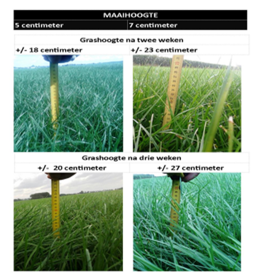Uit proeven blijkt dat een hogere stoppellengte zorgt voor een snellere hergroei en uiteindelijk tot een veel hogere grasopbrengst per hectare. Maaien bij 5 centimeter hoogte of 7 centimeter hoogte geeft na 2 weken al een verschil van 5 centimeter gewas, na 3 weken zelfs van 7 centimeter gewas.