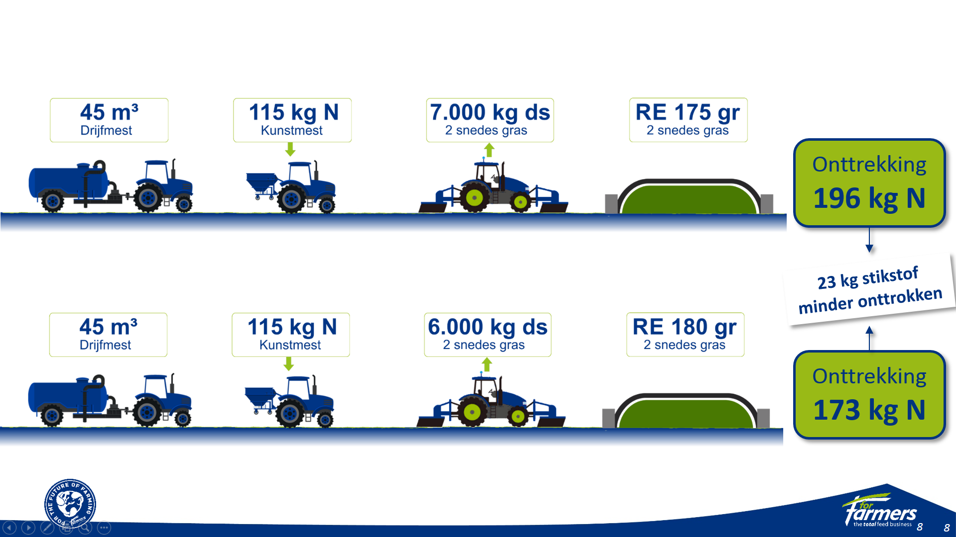 Om te voorkomen dat er veel N uitspoelt en het gras met een te hoog ruw eiwit (RE) gehalte wordt geoogst, is het goed om tijdens het seizoen het bemestingsplan nogmaals onder de loep te nemen.