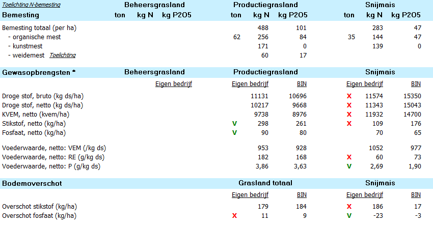bij het grasland als het maisland rond de 180 kilo stikstof, waarvan 179 op grasland en 186 op maisland. Het fosfaatoverschot is op grasland 11 kilo, en het fosfaattekort op maisland 23 kilo. Dit betekent dus dat er 23 kilo gram fosfaat meer geoogst is dan dat er bemest is.