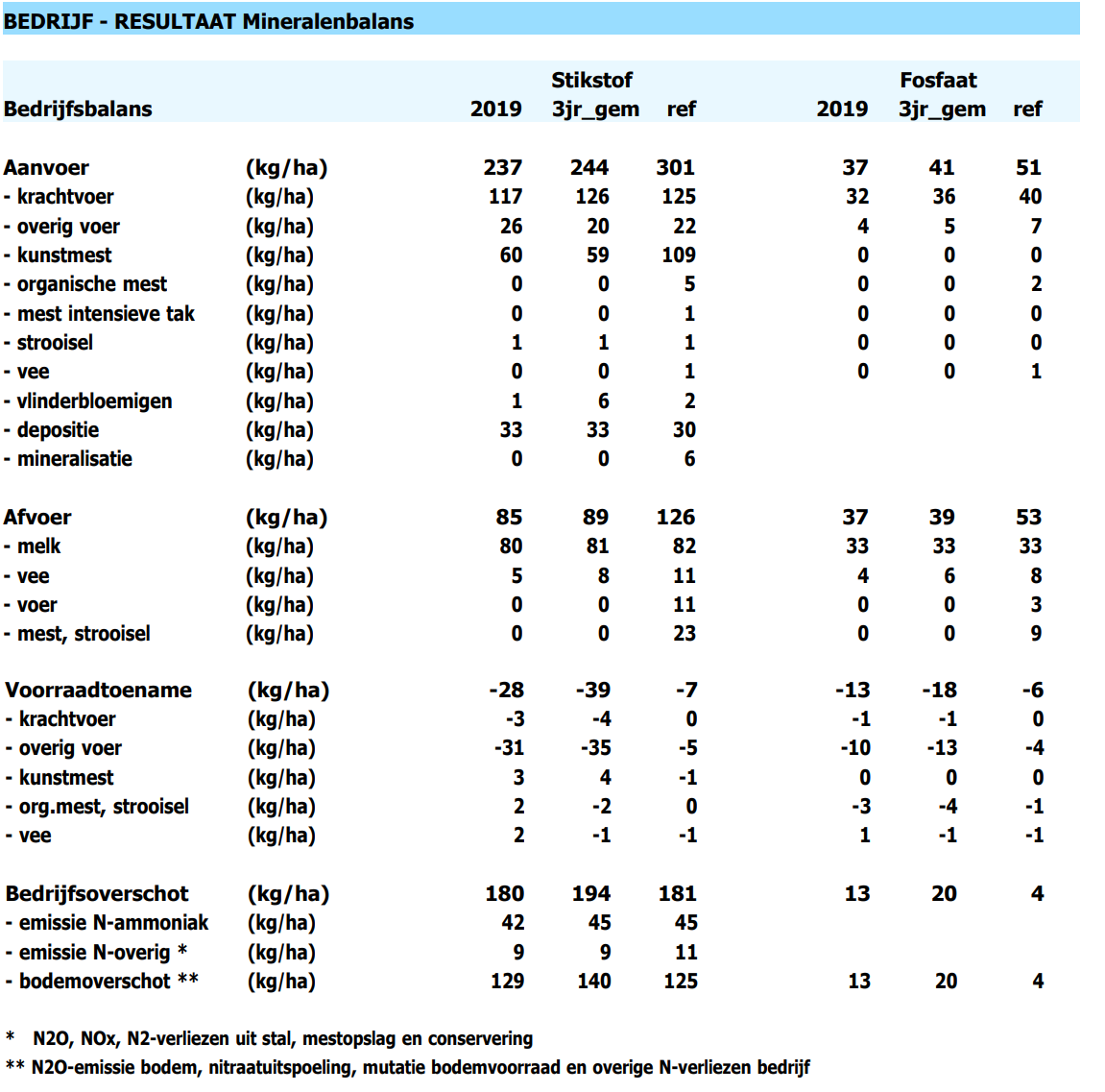 In onderstaande tabel een voorbeeld zoals de KringloopWijzer een mineralenbalans weergeeft. In de eerste kolom zijn de verschillende aan- en afvoerposten (in kg/ha) benoemd. De tweede kolom geeft de waarden voor het mineraal ‘stikstof’ weer . In de derde kolom staat het gemiddelde van de afgelopen drie jaren en in de vierde kolom een referentiewaarde. Dit is het gemiddelde van een groep bedrijven met dezelfde grondsoort en dezelfde intensiteitsklasse en dan als gemiddelde over de drie voorgaande jaren. De laatste drie kolommen gaan over fosfaat.