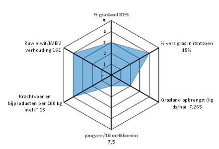 In het voorjaar van 2022 was de gezamenlijke aftrap van de 3e groep op het bedrijf van een van de veehouders. Daarbij draaide het vooral om de visie op, en kansen van eiwit van eigen land, de mogelijke maatregelen, de leerdoelen en ieders motivatie om met Home Made Eiwit aan de slag te gaan. Tijdens de rondgang op het bedrijf kwamen de verschillende aspecten aan bod die van invloed zijn op Home Made Eiwit. Na deze bijeenkomst zijn de veehouders individueel bezocht en is voor alle bedrijven een radardiagram opgesteld zoals hieronder weergegeven. Verder zijn de verbetermogelijkheden per bedrijf in kaart gebracht, net als de onderwerpen waar de veehouders zelf mee aan de slag willen. Daarbij ligt de focus altijd op voldoende eiwit telen én het eigen eiwit goed benutten.