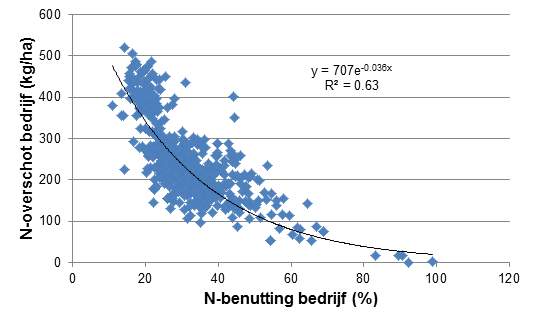 Op basis van de gevonden relatie uit Figuur 1 daalt dan het stikstofoverschot met 35 kg per ha, als de benutting met 5 procent punten stijgt. Van 275 tot 240 kg N per ha. Als voorbeeld nemen we een bedrijf met 40 ha grond. We gaan er van uit dat de toename van de benutting wordt gerealiseerd bij een gelijke melkproductie. Dus op de bedrijfsbalans blijft de afvoer gelijk. Dit kan dus alleen maar betekenen dat de afname van het stikstofoverschot is gekomen door een afname van de aanvoer van voer. Dit kan alleen doordat de stikstof op het eigen bedrijf via de bedrijfsonderdelen beter benut worden. Bijvoorbeeld door een betere benutting van de veestapel en/of door een betere benutting op de bodem door hogere gewasopbrengsten.