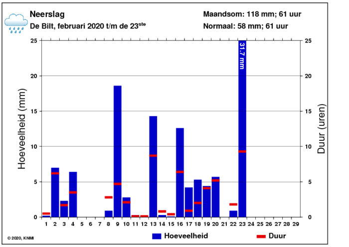 Na het extreem natte weekend blijft het verstandig om nog te wachten met het uitrijden van mest om structuurschade te voorkomen. Het neerslagkaartje laat zien dat op 23 februari op veel plekken in Nederland meer dan 20 mm neerslag viel, met uitschieters van meer dan 40 mm op een dag. In lager gelegen gebieden traden sloten buiten hun oevers en is het duidelijk dat je met het uitrijden van drijfmest nog even geduld moet hebben.