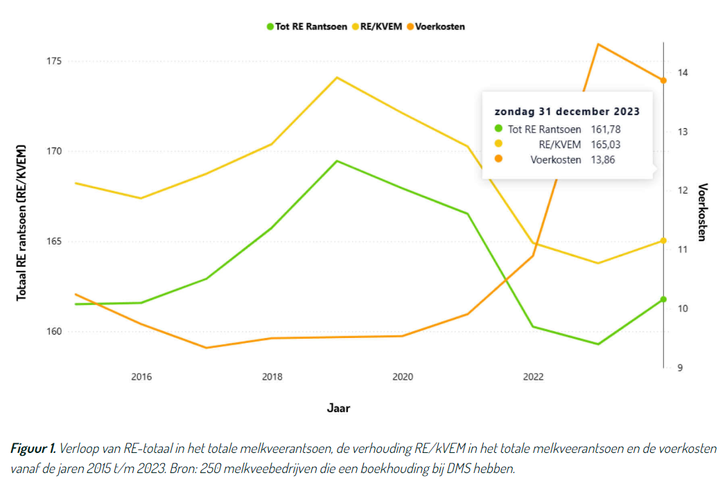 De voerkosten zijn zoals hierboven genoemd dus flink toegenomen in de afgelopen 25 jaar. Echter, voor het bepalen van een inkomen uit de melkproductie staat hier ook een inkomstenbron (melkgeld) tegenover. Deze is helaas in de afgelopen 25 jaar niet zo fors gestegen als de voerkosten. De gemiddelde melkprijs is hetzelfde tijdsbestek 5 cent gestegen. Steeds efficiënter met je voer omgaan is daarom een must. Dit benadrukt het belang van het goed benutten van je duurste productiefactor: je grond. Eigen voer eerst!”