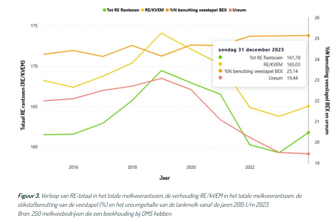 Interessant is dat de verhouding RE/kVEM van 2014 tot 2023 is gekrompen. “Dit laat zien dat het gebruik van een efficiënter rantsoen met een hogere energie-inhoud en een goed uitgebalanceerde hoeveelheid eiwit, uiteindelijk meer invloed heeft op de productie en gezondheid van de koeien, want de productie is wel blijven stijgen. Daarbij is het gemiddelde ureumgehalte in de melk sinds 2015 met ongeveer 3 punten gedaald, terwijl het ruw eiwitgehalte in het rantsoen nagenoeg gelijk bleef (zie figuur 3). Dit betekent dat het vinden van de juiste balans, in plaats van het simpelweg verlagen van het RE, belangrijker is voor zowel de gezondheid van de koeien, als de melkproductie. Dus verlagen van het RE in het rantsoen zonder negatieve gevolgen voor melkproductie en inkomen is wel mogelijk, als er voldoende energie wordt gevoerd.”