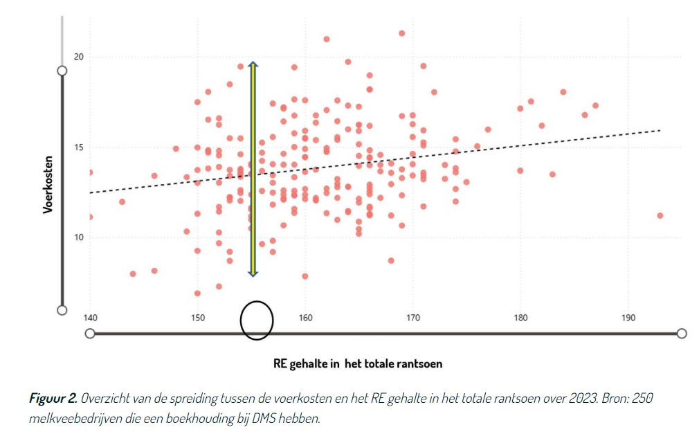 De relatie tussen het ruw eiwitgehalte in het rantsoen en het inkomen, is complexer dan het simpelweg verlagen van het RE-gehalte in krachtvoer om kosten te besparen, geeft Hans aan. “Uit mijn bevindingen en data blijkt dat het ruw eiwitgehalte in het rantsoen in 2016 nog gemiddeld 160 g per kg droge stof was. In 2018 steeg dit naar bijna 170 g per kg droge stof, maar in 2023 viel het weer terug naar 160 g per kg droge stof, zie figuur 1. De gemiddelde melkproductie is sindsdien echter niet significant veranderd, wat erop wijst dat een verlaging van het RE niet noodzakelijk leidt tot lagere melkproductie. Een lager RE in het rantsoen hoeft daarmee ook niet direct te leiden tot hogere voerkosten. Zie ook figuur 2. Daar zie je een grote spreiding in voerkosten bij de verschillende RE-gehalten in het rantsoen. Er is geen duidelijk dalende of stijgende trend. Bij 155 RE in het rantsoen (de gele pijl) is de variatie in voerkosten net zo groot als bij 165 RE in het rantsoen.”