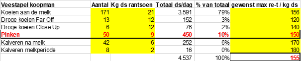 Door alle rantsoen gecombineerd te voeren volgens onderstaand schema zou het doel van 155 re-t gehaald kunnen worden.