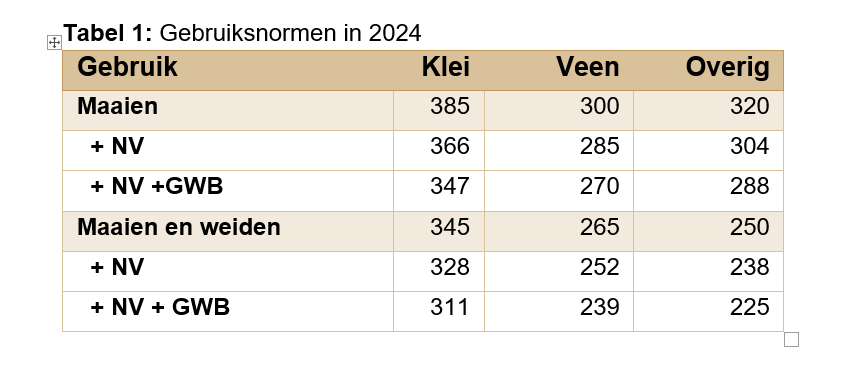 Let bij de bemesting op de mogelijk gewijzigde N-gebruiksnormen (Tabel 1), afhankelijk van de ligging van het perceel: in een nutriënt verontreinigd gebied of grondwaterbeschermingsgebied in een NV-gebied. De bemestingsadviesbasis (zie tabel 2.8 op pagina 58 van de bemestingsadviesbasis) geeft aan hoe de stikstofbemesting het beste is te verdelen over het seizoen, gekoppeld aan de snedezwaarte. Is de N-jaargift lager dan vorig seizoen, kijk dan een paar regels lager in de tabel. De verdelingstabel zorgt ervoor dat er ook later in het seizoen nog stikstof beschikbaar is voor het gras.