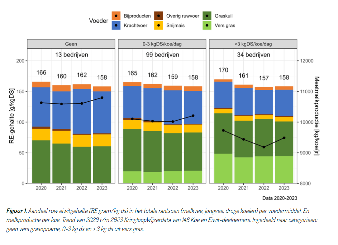 Er zijn duidelijke verschillen in opbouw van het RE-gehalte in het rantsoen en melkproductie per koe, tussen bedrijven die geen vers gras voeren en bedrijven die wel vers gras voeren in de vorm van beweiden of zomerstalvoedering. Dit blijkt uit figuur 1 waarin 146 bedrijven zijn ingedeeld in drie categorieën m.b.t. vers gras voeren. In alle categorieën is het RE-gehalte vanaf 2020 gedaald naar 158 gram per kg ds. Het RE-aandeel uit krachtvoer is bij de opstallers duidelijk het hoogst en is zelfs in 2022 en 2023 gestegen ten opzichte van 2020 en 2021. Ook voeren de opstallers meer mais. De melkproductie per koe is gemiddeld in alle drie de categorieën in 2023 gestegen. De productie per koe is op de bedrijven die veel vers gras voeren gemiddeld wél ca. 800 tot 1400 kg lager dan op de bedrijven die geen vers gras voeren. Op de vers gras bedrijven is de melkproductie per koe vanaf 2020 bovendien duidelijk gedaald en in 2023 echter het meest gestegen.