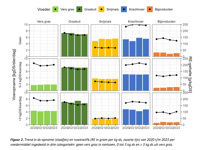 Bij de opstallers is de ds-opname uit mais ongeveer gelijk aan de ds-opname uit krachtvoer. Echter de aanvoer van RE uit krachtvoer is veel hoger door de hoge eiwitgehalten in het krachtvoer. Op de bedrijven met veel vers gras is de ds-opname hiervan ongeveer gelijk aan die van krachtvoer. De eiwitgehalten in vers gras zijn wel iets hoger dan in krachtvoer. Verder valt op dat gemiddeld in alle categorieën het RE in de graskuil vanaf 2020 gedaald is tot 2022, en in 2023 ongeveer gelijk blijft of zelfs iets stijgt. Het sturen naar een lager RE in 2023 in het totale rantsoen, blijkt vooral te komen door lager RE% in het krachtvoer.