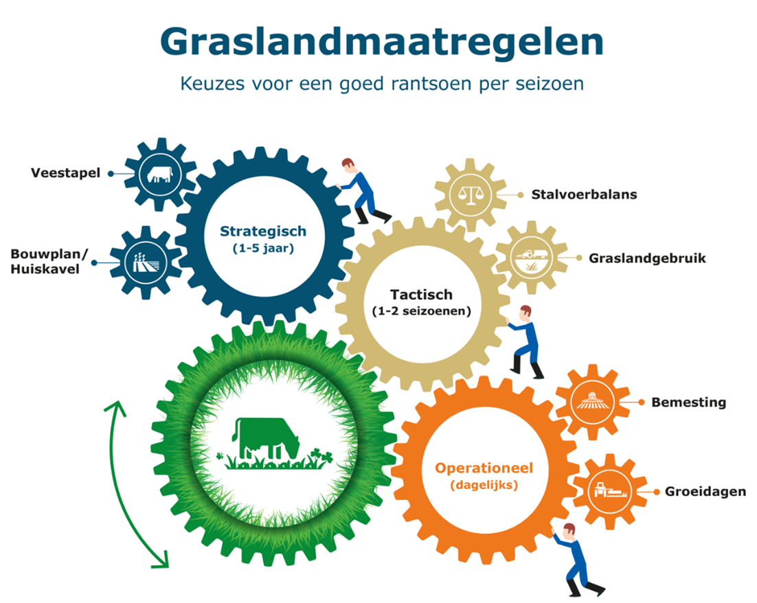 Om door het jaar heen te sturen op veel vers weidegras én een optimale kwaliteit van vers gras en kuilgras, is zoals gezegd vakmanschap nodig. Binnen het Praktijkproject Graslandmanagement bleek het essentieel vooraf al een goed graslandgebruik en graslandmanagement te plannen. Het is het meest effectief om niet alleen te kijken naar bemesting of oogsttijdstip (operationeel), maar ook naar het aandeel maaien en weiden (tactisch) en ook naar bijvoorbeeld het bouwplan (strategisch). De totale planning van vooraf een ruwvoerplan en een goed rantsoen per seizoen blijft daarvoor een succesformule. Zo bleek ook in een workshop van november 2024 met alle bedrijven. Deze inzichten zullen komende jaren verder gebruikt worden in vervolg onderzoek- en praktijkprojecten, om ze zo volledig te ontsluiten voor de praktijk. Kijk voor een samenvatting van resultaten en inzichten van het project. De strategische, tactische en operationele keuzes in graslandmanagement houden allemaal verband met elkaar. In de infographic is schematisch weergegeven wat de belangrijkste draaiknoppen zijn om slimme keuzes te maken voor een goed rantsoen per seizoen.