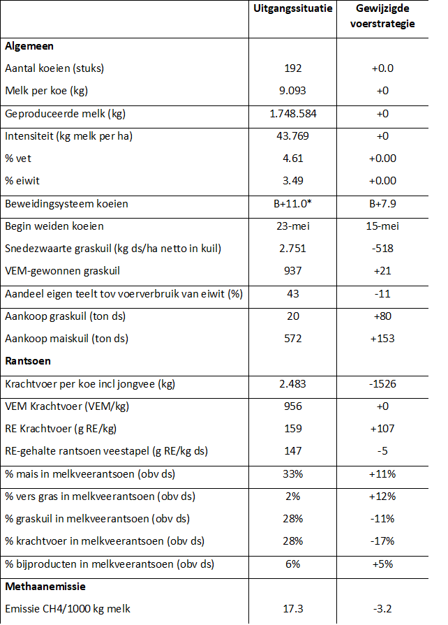 Voor het realiseren van methaanreductie zal het sturen op de ruwvoerkwaliteit het grootste effect geven. De wijziging van de voerstrategie is daar dan ook vooral op gericht. Dekker kiest in de berekening voor meer weiden, lichter maaien en meer mais aankopen in plaats van graskuil. Daarnaast wordt met een methaanarm krachtvoer van 0,3 kg ds vet per koe per dag en 2 kg ds maisglutenvoer per koe per dag het rantsoen verder geoptimaliseerd voor de reductie van de methaanemissie. Dit betekent dat Johan z’n handelsgeest enigszins moet laten varen, omdat hij als intensief melkveebedrijf altijd voermarkt nauwlettend in de gaten houdt om zo interessante partijen graskuil en bijproducten aan te kunnen kopen. Bij de methaanreductiestrategie kiest Dekker in deze berekening ervoor om structureel maisglutenvoer en voeraardappelen als bijproduct te voeren in plaats van witlofwortelen en tarwegistconcentraat. Maar daarnaast moeten ze ook de invulling van de beweiding drastisch wijzigen. De huiskavel is nu maar voor een deel beweidbaar en de opname aan vers gras kan in de nieuwe strategie, waarbij meer beweiding plaatsvindt met 10% toenemen.