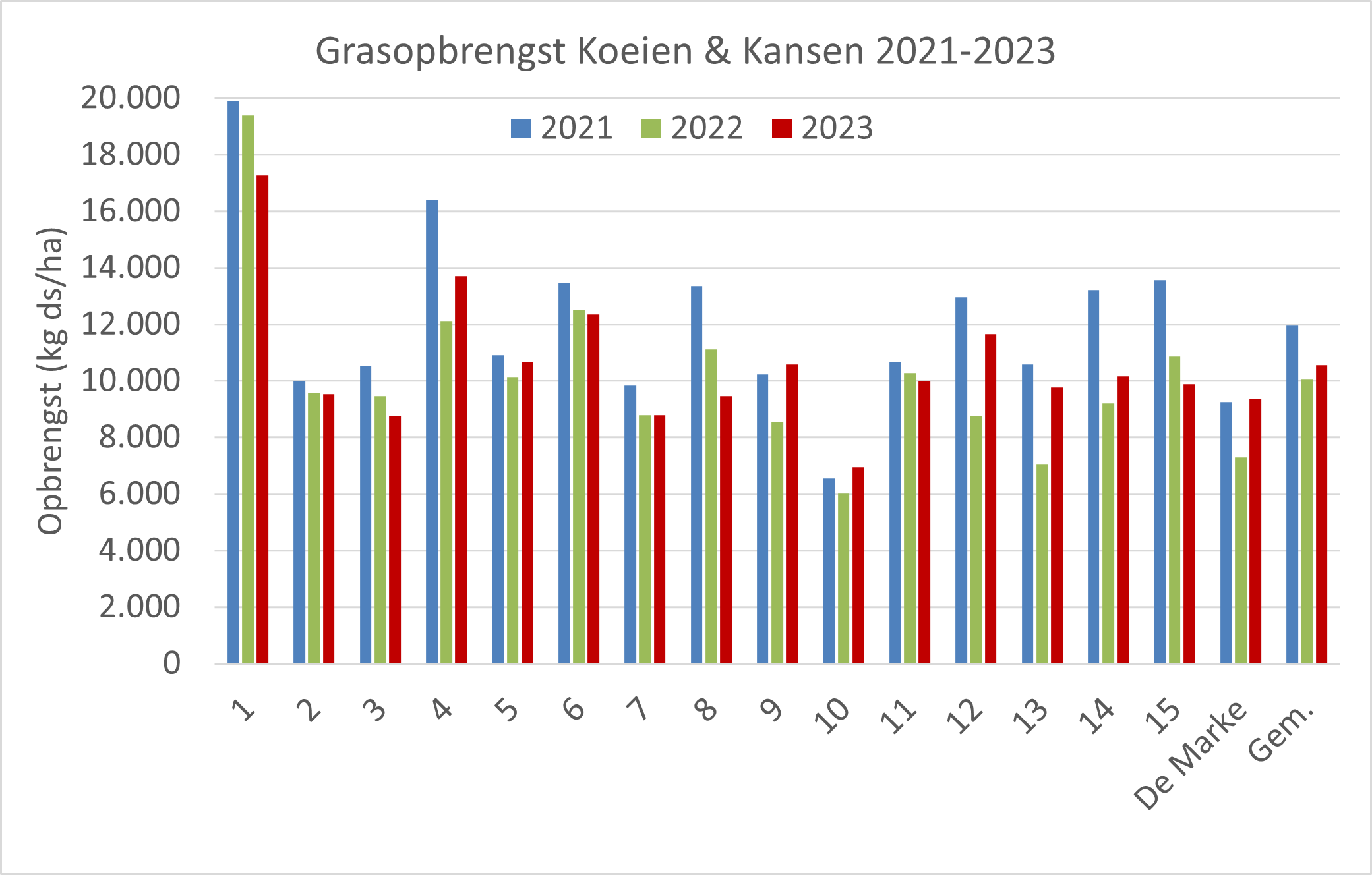 De gewasopbrengsten op de Koeien en Kansen-bedrijven waren in 2023 gemiddeld hoger dan in het door droogte geteisterde jaar 2022. De grasopbrengst was gemiddeld bijna 500 kg ds per ha hoger en de maïsopbrengst gemiddeld ruim 1200 kg ds/ha hoger. Door het droge begin van de zomer bleef de grasopbrengst op de meeste bedrijven nog wel iets achter ten opzichte van 2021, maar de vrij natte tweede helft van de zomer zorgde ervoor dat er meer gewas groeide dan in 2022.