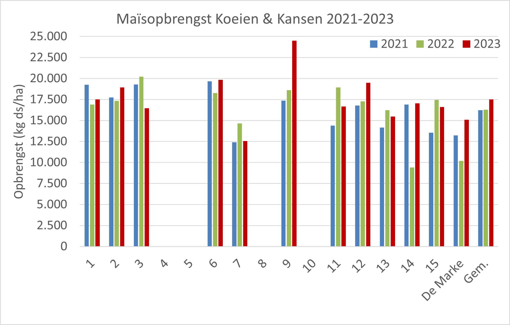 Figuur 3 toont dat de gemiddelde maïsopbrengst op de Koeien & Kansen-bedrijven in 2023 rond de 17.500 kg droge stof (ds) per hectare ligt, een stijging van ruim 1200 kg ds/ha ten opzichte van 2021 en 2022. Op veel bedrijven die in 2022 geen last hadden van de droogte, wijkt de maïsopbrengst in 2023 niet veel af van voorgaande jaren. Bedrijven die in 2022 wel zwaar getroffen werden door droogte, zoals bedrijven 14 en De Marke, konden dankzij voldoende neerslag in de tweede helft van de zomer een aanzienlijk hogere maïsopbrengst realiseren dan in 2022. De Marke behaalde zelfs zonder beregening een hogere opbrengst dan in 2021.