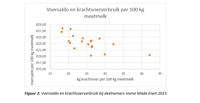 Er is wel een verband tussen het krachtvoerverbruik per 100 kg meetmelk en het voersaldo per 100 kg meetmelk. Zie ook figuur 2. Hoe lager het krachtvoerverbruik, hoe hoger het voersaldo.