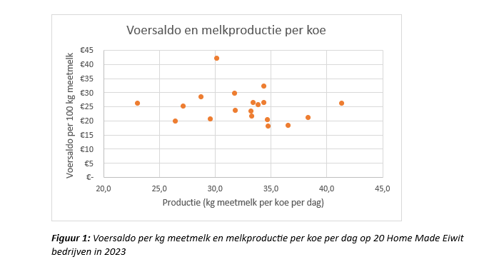 Het verschil tussen de voerkosten en de melkopbrengsten is het voersaldo: de dagelijkse kosten van het voer worden van de melkopbrengsten per dag afgetrokken. Er wordt vaak vanuit gegaan dat met een hogere melkproductie ook het voersaldo toeneemt. Maar wanneer het voersaldo per 100 kg meetmelk wordt uitgedrukt, is het verband tussen de melkproductie en het voersaldo verdwenen. De melkproductie per koe zegt dus niets over het voersaldo per 100 kg meetmelk. Zie figuur 1 waar er geen stijgende trend te zien is bij het voersaldo naarmate de melkproductie hoger wordt.
