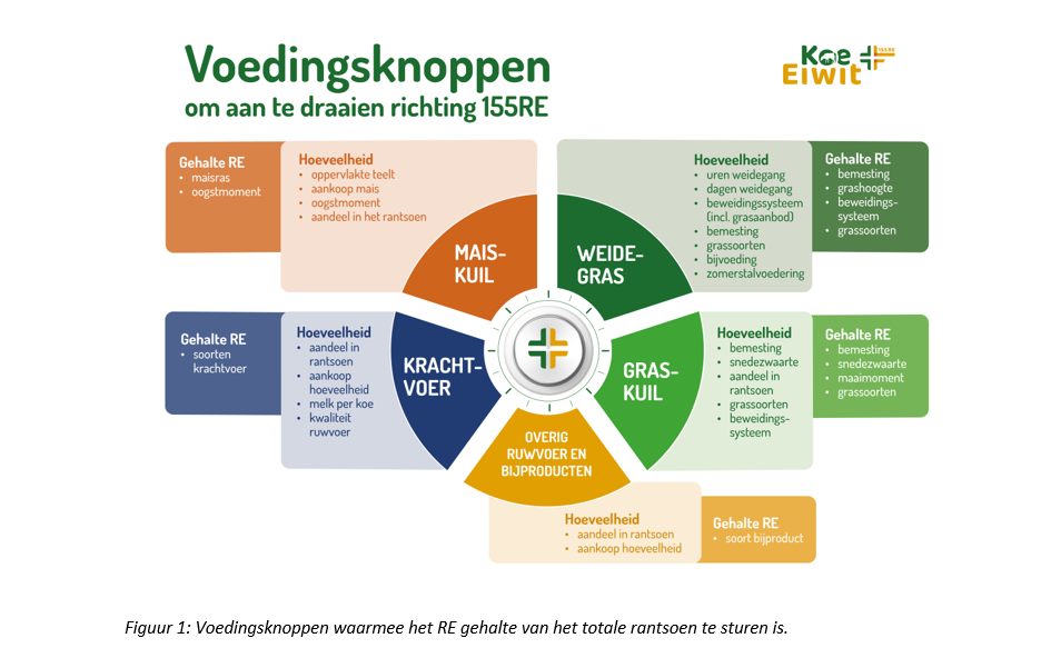 Het ruw eiwitgehalte van het totale bedrijfsrantsoen wordt bepaald door de hoeveelheid en samenstelling van de voedermiddelen in de rantsoenen van de verschillende diergroepen op een bedrijf (jongvee jonger dan een jaar, jongvee ouder dan een jaar, droge koeien en lacterende koeien). Figuur 1 maakt inzichtelijk aan welke knoppen je kunt draaien om het RE gehalte in het totale rantsoen te verlagen.