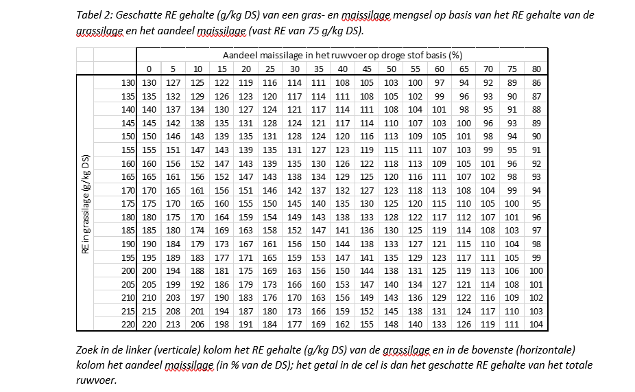 Deze tabel geeft een indicatie van het RE gehalte van het basisvoer op basis van het maisaandeel in het rantsoen (de horizontale as) en het RE gehalte van de grassilage (de verticale as). Het RE gehalte van het basisrantsoen kan dan worden afgelezen in de cel die het juiste maisaandeel en RE van grassilage combineert. Dit getal wordt vervolgens gebruikt in Tabel 3.