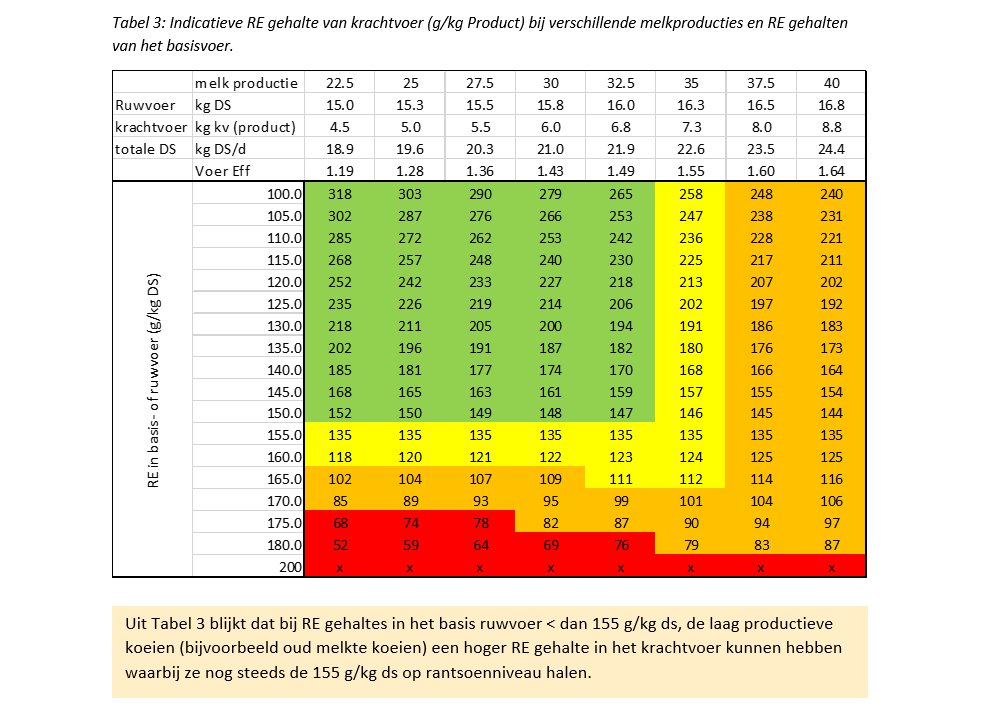 De kleuren in Tabel 3 geven aan of een dergelijk krachtvoer makkelijk of moeilijk te maken is (beneden de rij van 150 g RE in het basisrantsoen wordt het steeds moeilijker) of hoe makkelijk het rantsoen nog op DVE en OEB te balanceren is (rechts van de 32.5 liter melk wordt het steeds moeilijker). De RE gehaltes in de groene cellen zijn relatief eenvoudig haalbaar. Krachtvoerders met gehaltes in gele cellen zijn moelijker haalbaar (m.b.t. RE in krachtvoer of het balanceren van het totale rantsoen op DVE en OEB). Oranje cellen zijn nog moeilijker haalbaar en rode cellen zijn niet haalbaar. Uit de tabel blijkt dus ook dat het bij bepaalde combinaties van melkproductie en RE in het basisrantsoen niet mogelijk is een RE van 155 op rantsoenniveau te halen.