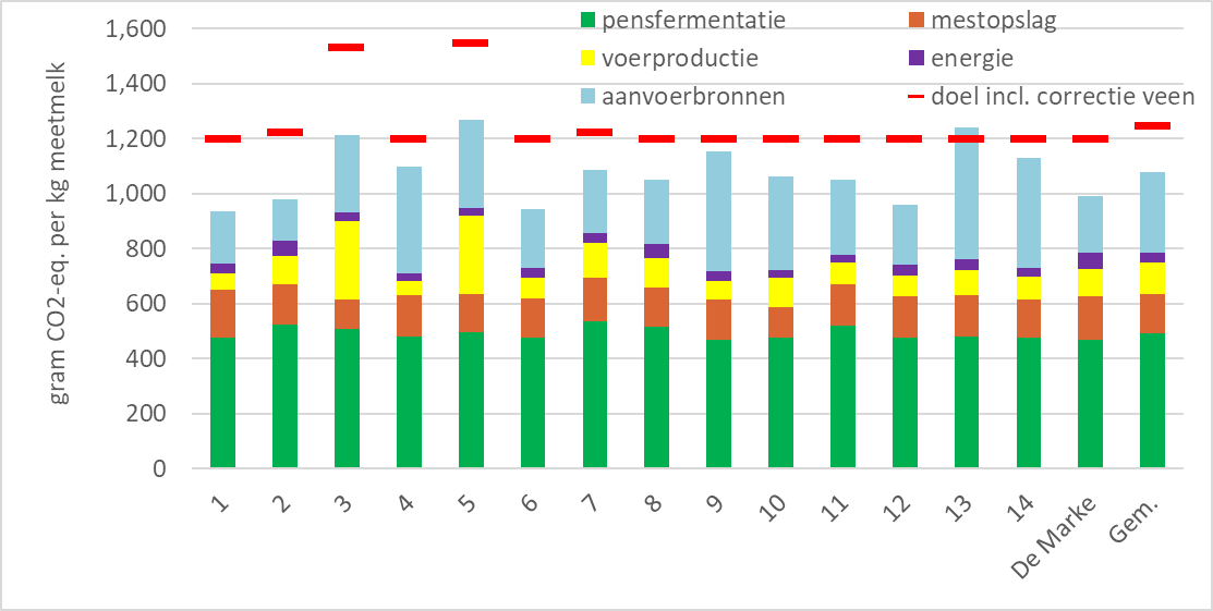 In figuur 1 is de totale broeikasgasemissie van de Koeien en Kansen-bedrijven in 2021 weergegeven. Deze figuur laat zien dat de emissie van de bedrijven gemiddeld uitkomt op 1078 gram CO2 equivalenten per kg meetmelk. De gemiddelde doelstelling van bijna 1250 gram CO2-equivalenten per kg meetmelk melk (inclusief de aanpassing bij veengrond) wordt in 2021 gemiddeld ruimschoots gehaald. Alleen bedrijf 13 heeft een iets hogere uitstoot van broeikasgassen dan het gestelde bedrijfsdoel, dit bedrijf heeft een hoge emissie uit aanvoerbronnen zoals krachtvoer. De bedrijven 3 en 5 hebben voornamelijk veengrond en hebben daarom een doel dat in de buurt van de 1550 gram CO2-equivalenten per ton meetmelk ligt.