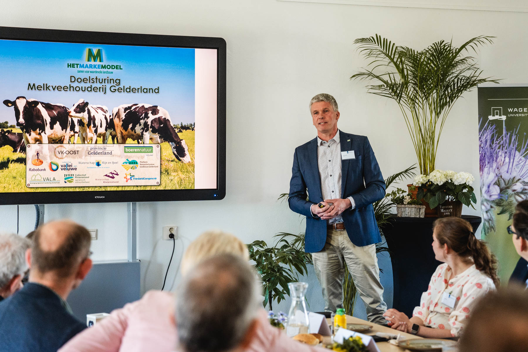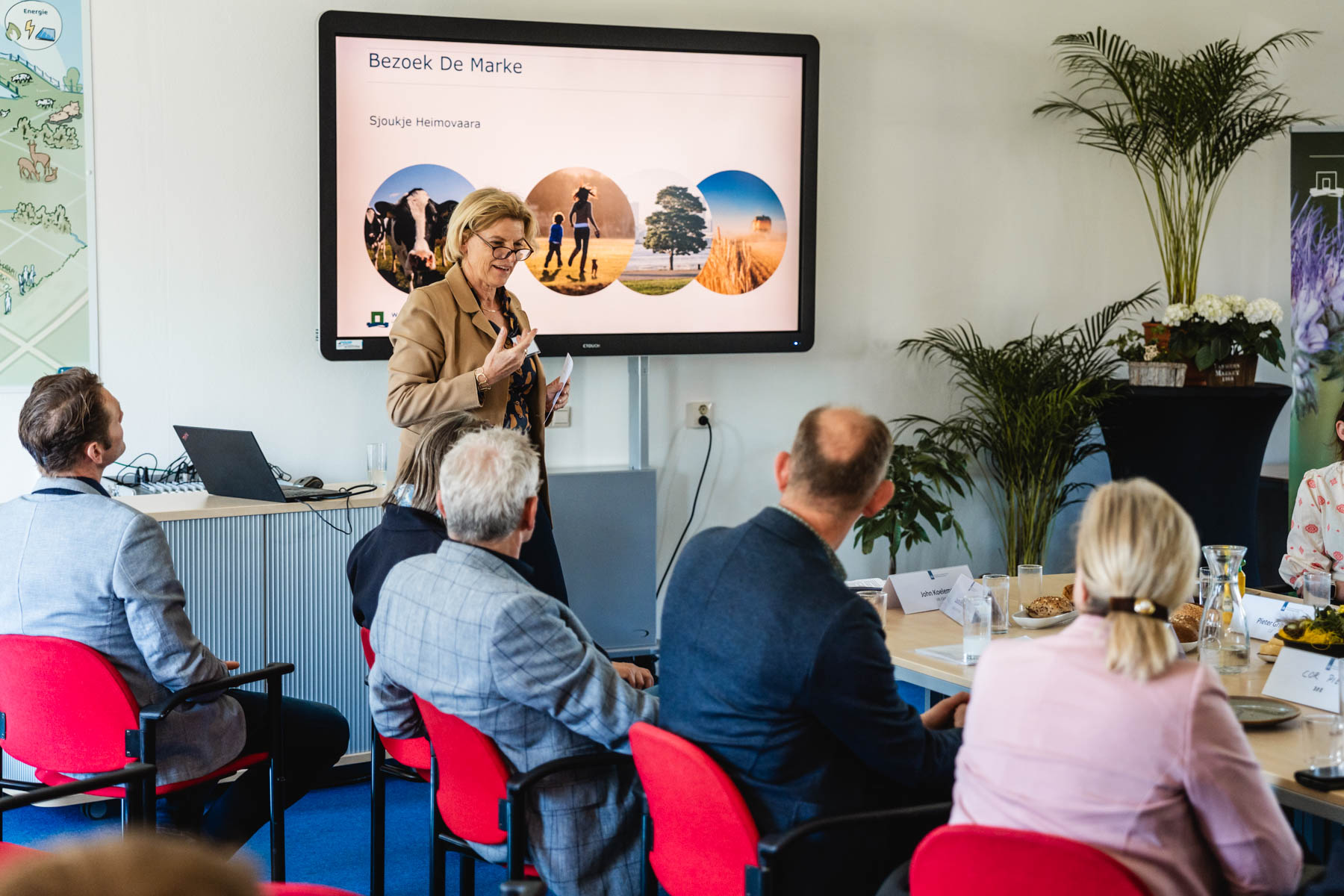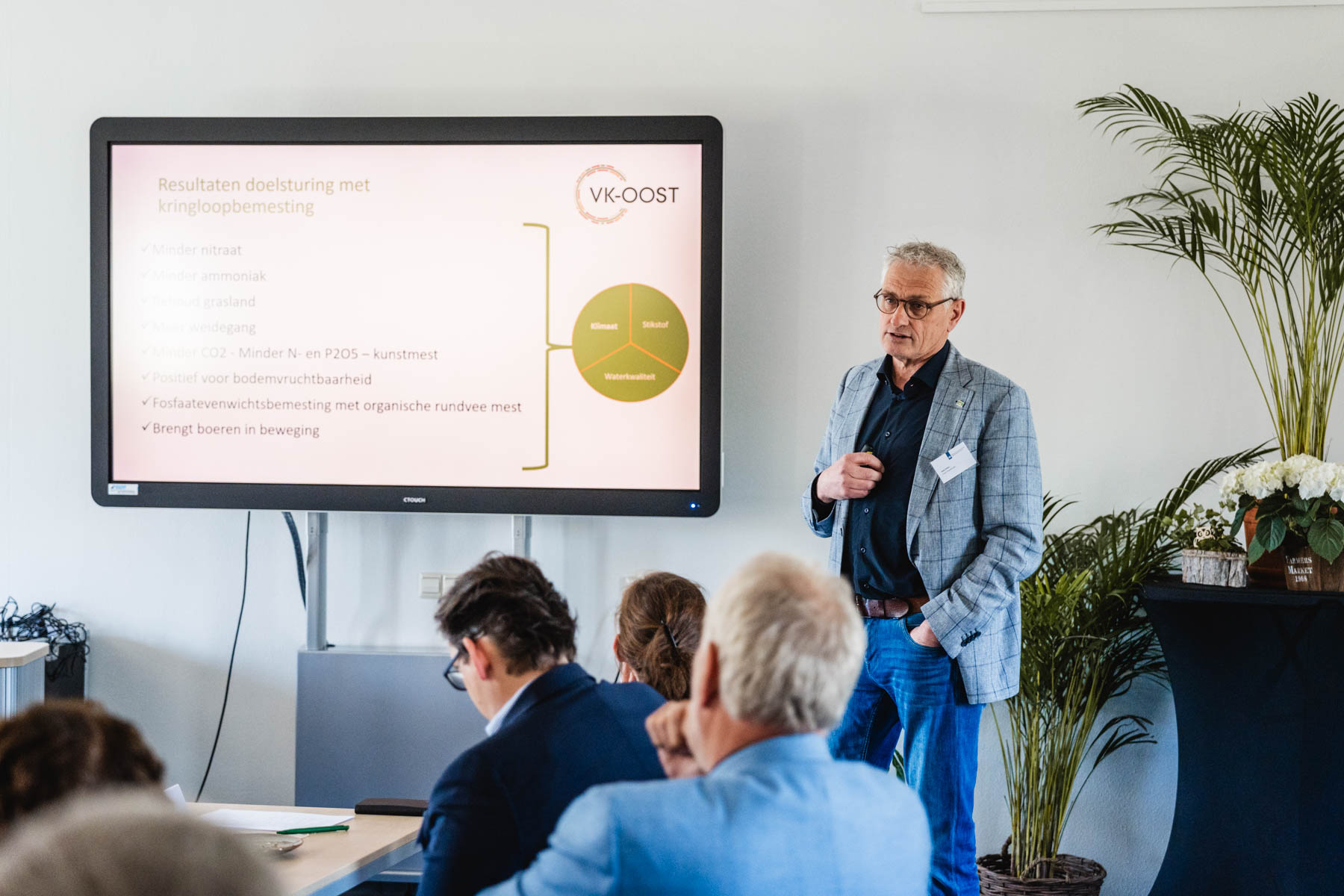 Na een fotomoment werd het werkbezoek vervolgd met een lunchgesprek. Een belangrijk onderdeel van het bezoek was de presentatie van het Markemodel en het voorstel voor doelsturing met kringloopbemesting door Dick Looman en Jaap Gielen, namens VALA en VK-Oost. Het Markemodel laat zien hoe doelsturing boeren kan helpen bij het maken van duurzame keuzes, passend binnen hun bedrijfsvoering. Ook werd ingegaan op de kracht van regionale samenwerking tussen onderzoek, agrariërs en lokale partijen, toegelicht door Sjoukje