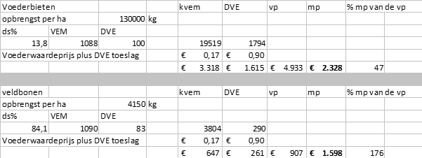 Vorig jaar bedroeg de opbrengst 160 ton voederbieten per hectare en afgelopen jaar bedroeg de opbrengst 130 ton per hectare. Bij een droge stofpercentage van circa 14% een opbrengst van 18 ton droge stof per hectare. In de voerderwaarde prijsvergelijking scoren voederbieten dan ook beter dan de veldbonen.