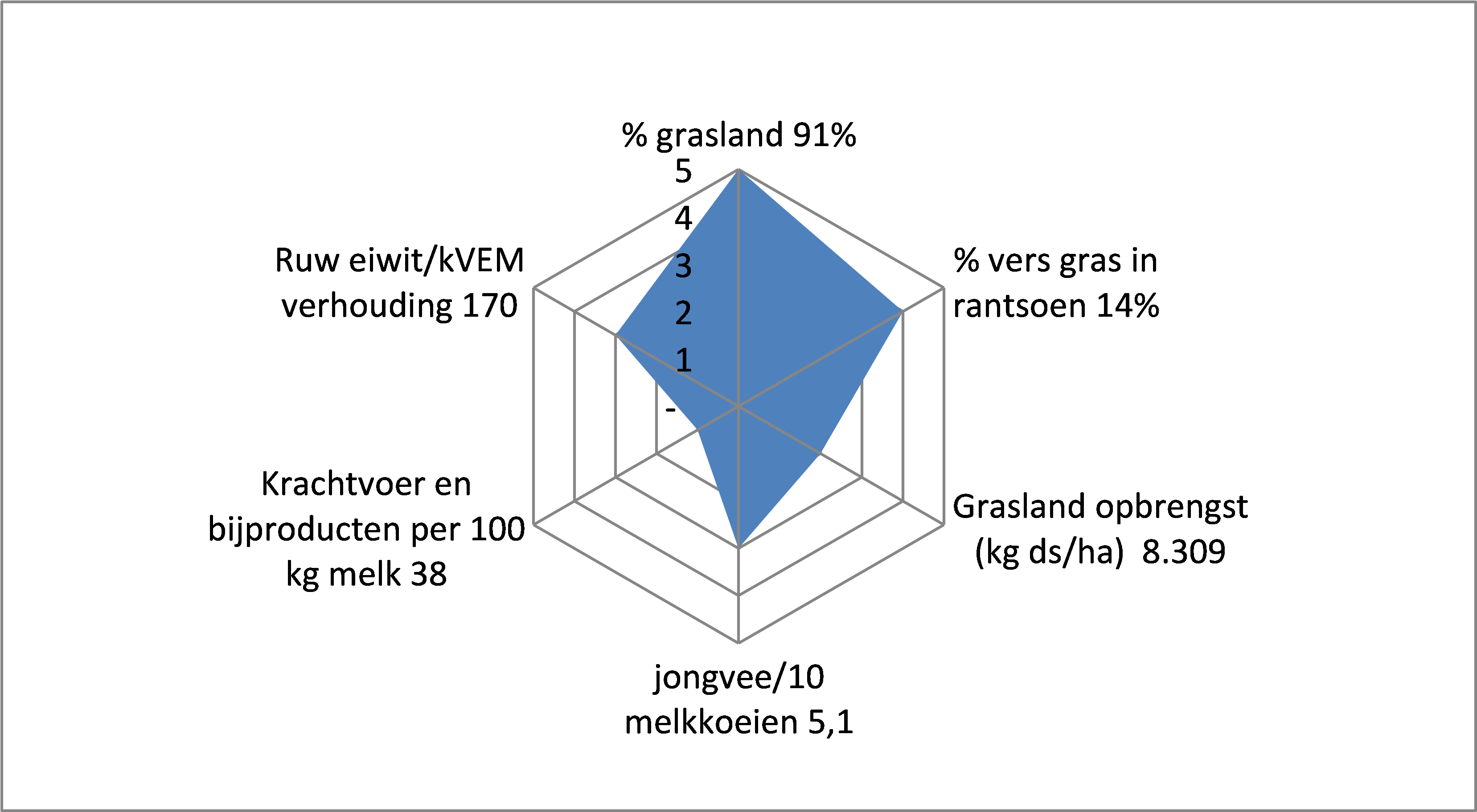 Uit de radardiagram van De Groot blijkt dat zijn bedrijf optimaal op % grasland scoort. Hij teelt op 91 procent van zijn totale oppervlakte gras, waarvan 1/3 natuurgrasland en 2/3 bestaat uit productiegrasland. Een perceel van 38 hectare ligt achter de stal. Het merendeel van dit blok gebruikt hij voor de beweiding. Het beweiden is sinds de intrede van de melkrobot in 2018 nog niet zo eenvoudig. ‘’Het komend jaar hoop ik dat de koeien nog meer gras zelf uit de wei halen. Voor de melkrobot hadden we ze dag en nacht buiten in de zomerperiode.  Nu lukt het alleen om ze overdag te laten weiden en dan is het nog lastig om ze voldoende uren buiten te laten grazen. Zowel de koeien als de boer moeten wennen aan deze nieuwe situatie. Het is een hele puzzel om de koeien optimaal te laten grazen. We experimenteren nog wat met het aanbieden van vers gras, volgens het Nieuw Nederland Weiden, en bijvoeding in de stal.