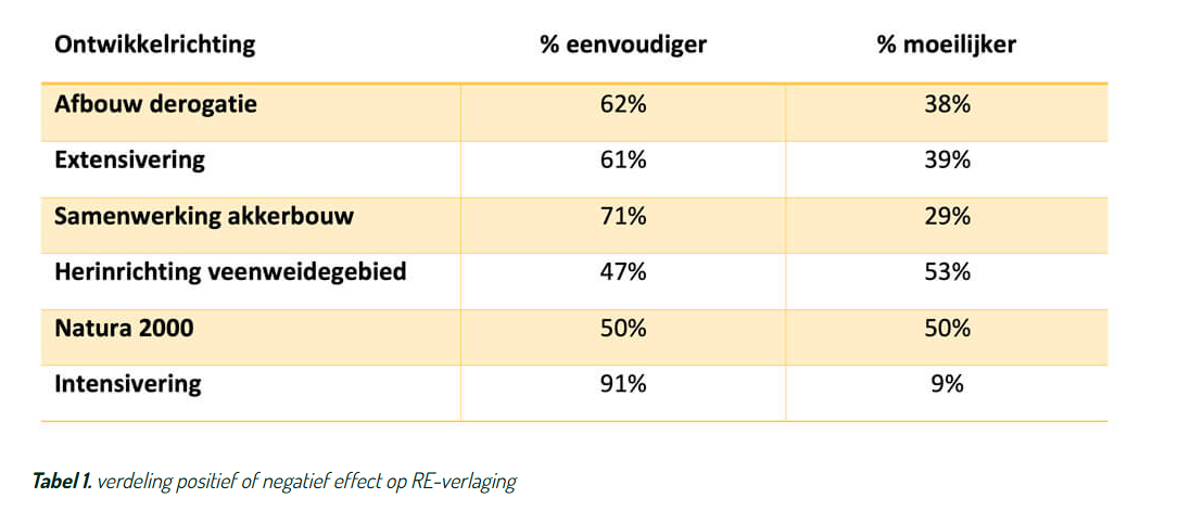 Naast de onderwerpen die waarschijnlijk het meeste invloed hebben op de eiwitvoeding, is ook gevraagd of deze onderwerpen het juist makkelijker of moeilijker maken om het projectdoel van 155RE te behalen. Ongeveer 2/3 van de deelnemers geeft aan dat de ontwikkelingen een positief effect hebben op het behalen van het RE-doel. De verandering in bemesting speelt hierin een belangrijke rol. Door de afbouw van derogatie wordt drijfmest vervangen door kunstmest. De totale N-gift blijft weliswaar gelijk, echter drijfmest heeft een ander effect op de bodem dan kunstmest. En door het vervallen van de derogatie kan er meer mais of voederbieten geteeld worden. De N-gift wordt wel lager als je percelen in een Nutriënt Verontreinigd (NV) gebied liggen, vanwege de lagere gebruiksnormen. Vooral in deze gebieden is het een uitdaging om de gewasopbrengst en -kwaliteit in stand te houden.