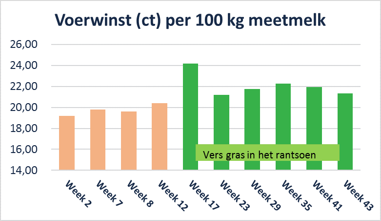 De doorgevoerde bedrijfsaanpassingen maken het mogelijk om deze ambitieuze doelstelling voor de beweiding in het plan van aanpak 2021 op te nemen. Na de extensivering gingen de koeien gemiddeld 1.300 uur naar buiten. Het plan voor 2021 is dit te verhogen naar 1.700 uur. Ruwweg moet dit leiden tot 16% vers gras in het rantsoen op jaarbasis en ca. 8 kg ds vers grasopname per beweidingsdag met roterend standweiden. De voerwinst zal stijgen met 30 ton graskuil รก 13,4 ct per kg ds gaat vervangen worden door vers gras van 5 cent per kg ds. Daarnaast moet een besparing van ca. 1.000 kg krachtvoer mogelijk zijn, door de hogere VEM waarde van vers gras.
