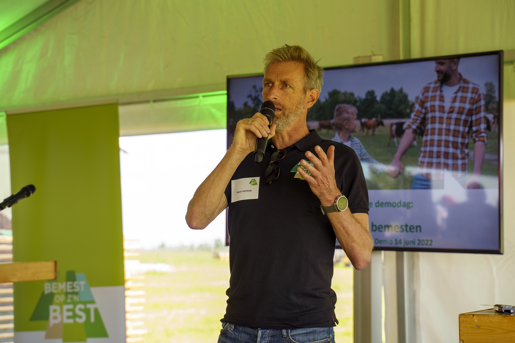 De veengronden van melkveehouderij De Heihoeve in Giessenburg vormen het decor tijdens deze zonnige morgen. Programmamanager Koos Verloop van de WUR verwelkomt de deelnemers in de volle tent in een weiland van De Heihoeve. Hij start zijn verhaal met de missie en de doelen van het programma; te weten een halvering van ammoniakemissie tijdens mesttoediening op het land en het creëren van draagvlak voor toepassing van innovaties om dit te bereiken. Doelen die uiteindelijk een bijdrage moeten leveren aan het oplossen van de stikstofproblematiek en het vinden van een betere balans tussen boer, burger en milieu. “Na de recente kamerbrieven van ministers Van der Wal (Stikstof) en Staghouwer (LNV) en de plannen rondom het Nationaal Programma Landelijk Gebied, is de noodzaak tot innoveren alleen maar duidelijker”, benadrukt Koos. “Er valt nog een wereld aan ammoniakreductie te winnen door een zorgvuldigere mesttoediening én door het bedenken en toepassen van nieuwe technieken. We zijn het aan onszelf verplicht om alle kennis en mogelijkheden te benutten om mede via deze route die betere balans te bereiken.”