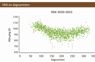 De temperatuursom (T-som) wordt berekend dooralle gemiddelde dagtemperaturen boven 0 graden vanaf 1 januari op te tellen.De temperatuursom in de 28 dagen voorafgaand aan de monstername van het verse gras, heeft een grote invloed op de voederwaarde van vers gras. Hoe hoger de T-som is geweest, des te lager is de voederwaarde. Zo is de VEM-waarde bij een T-som van slechts 200 graden gemiddeld 1.050, terwijl bij 600 graden in 28 dagen gemiddeld 900 VEM gemeten wordt. Ook het suikergehalte daalt bij een hogere cumulatieve temperatuur, terwijl de NDF-waarde daarentegen stijgt bij een hogere T-som. Het ruw eiwitgehalte vertoont geen relatie met de T-som. Ook deze trends zijn in 2020, 2021 en 2022 vergelijkbaar, dus voorspelbaar.