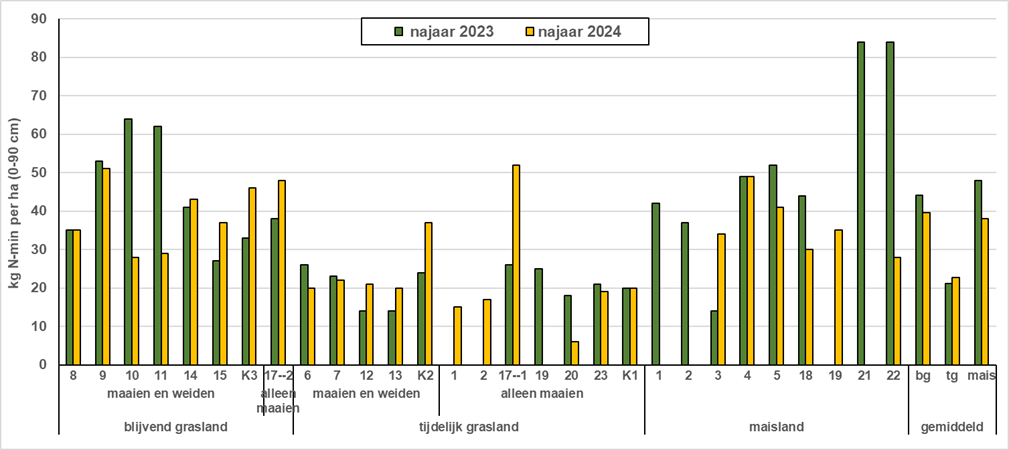 In 2023 en 2024 is op alle percelen van De Marke direct na de laatste oogst het nitraatresidu gemeten in de bodemlaag 0-90 cm. In de figuur staan de resultaten.