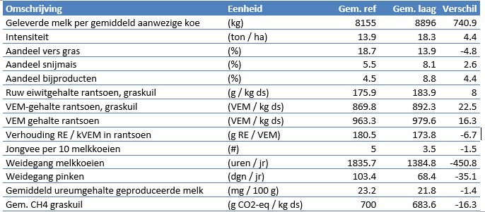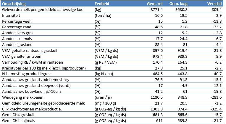 De groep bedrijven met de 10% laagste broeikasgasemissie per kilogram meetmelk hadden gemiddeld een hogere melkproductie per koe, een hogere intensiteit per hectare en een laag percentage of geen veengrond. Daarnaast beschikten deze bedrijven over een hoger energie (VEM-)gehalte in de graskuil en in het totale rantsoen. De verhouding eiwit/energie (RE/kVEM) in het rantsoen lag lager. De bedrijven verstrekten minder krachtvoer per 100 kilogram melk en pasten een lagere N bemesting toe. Ook realiseerden deze bedrijven een lager ureum, lagere carbon footprint van het krachtvoer en een lagere methaan (CH4) emissiefactor voor hun gras- en snijmaiskuil.
